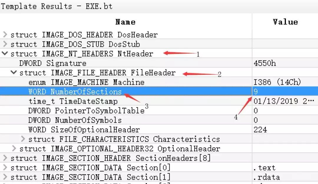 使用010Editor打开测试程序,按alt+4出现一个模板菜单找到NumberOfSection把该数字加1,这里改为了9。
