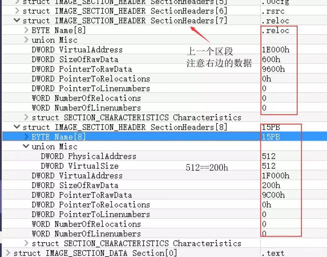 ⑤ 区段的PointerToRawData(区段数据在文件中的偏移),此值必须是:上一个区段的PointerToRawData + 上一个区段的SizeOfRawData