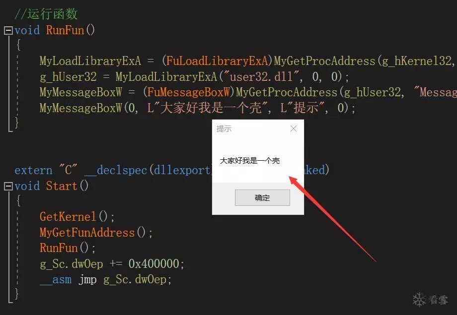 MyMessageBoxW(0, L"大家好我是一个壳", L"提示", 0);