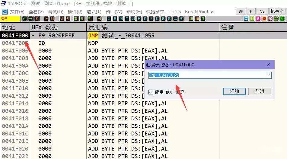 然后再使用OD打开,进入到入口点就是41F000,因为默认加载基址是0x400000, 发现全是00 00 00的字节,没用内容。把第一行代码改为跳转到原来的入口点jmp 0x411055,然后打一个补丁,程序就能正常运行了。