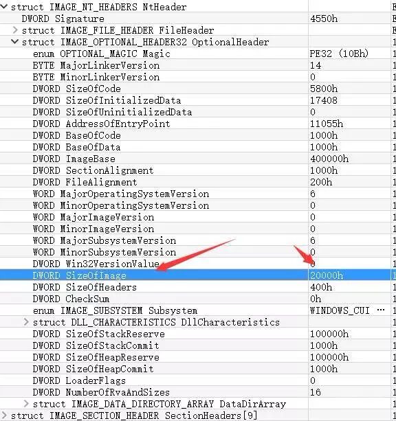 现在PE文件已经被扩充了大小,扩展头中的映像大小必须更新,否则当PE文件加载到内存后,新区段的数据将无法得到正常加载。